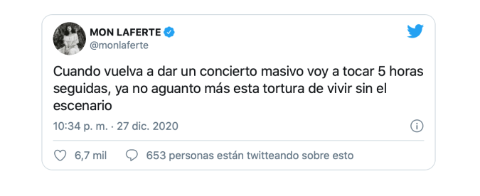 Para muchos artistas y miembros del espectáculo la pandemia les trajo muchos claroscuros, hubo quienes produjeron hermosas creaciones como Reik o quienes lamentaron demasiado el cierro y la lejanía de su público como señala Mon Laferte, misma que ha sido más activa que de costumbre en sus redes sociales, al estar comunicándose o escribiendo sobre todo lo que le acontece o sorprende, como recientemente la Ley a favor del aborto en Argentina.
