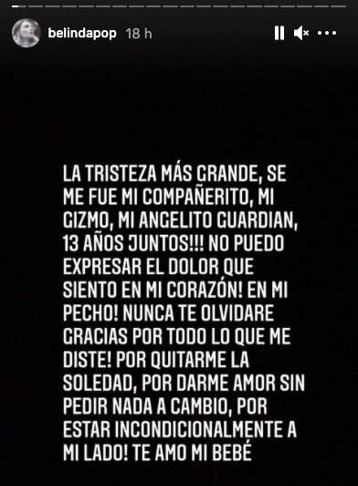 La joven de 28 años mencionó en sus historias de Instagram el gran dolor que le deja la partida de este mundo de su pequeño amigo: