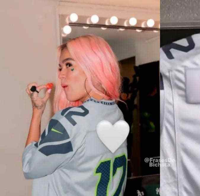 En una primera fotografía aparece Karol G posando de espalda con una camisa over size que tiene el dorsal número 12, pero decidió tapar con un corazón blanco el nombre que tenía plasmado la camiseta deportiva.