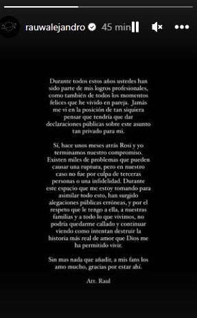 “Durante este espacio que me estoy tomando para asimilar todo esto, han surgido alegaciones públicas erróneas, y por el respeto que le tengo a ella, a nuestras familias y a todo lo que vivimos, no podría quedarme callado y continuar viendo como intentan destruir la historia más real de amor que Dios me ha permitido vivir. Sin mas nada que añadir, a mis fans los amo mucho, gracias por estar ahí”, finalizó.