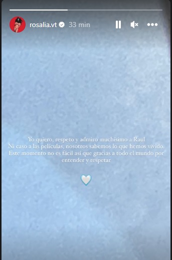 «Yo quiero, respeto y admiro muchísimo a Raúl. Ni caso a las películas, nosotros sabemos lo que hemos vivido. Este momento no es fácil, así que gracias a todo el mundo por entender y respetar», fue lo que dijo Rosalía, aclarando que hay especulaciones en torno a la razón de su ruptura del compromiso.