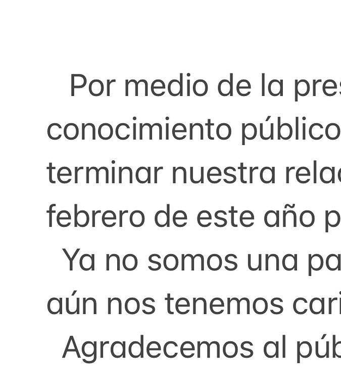 En el texto publicado en Instagram indicaron: «Por medio de la presente, haremos de conocimiento público que hemos decidido terminar nuestra relación de pareja desde febrero de este año por mutuo acuerdo. Ya no somos una pareja sentimental, pero aún nos tenemos cariño y respeto».