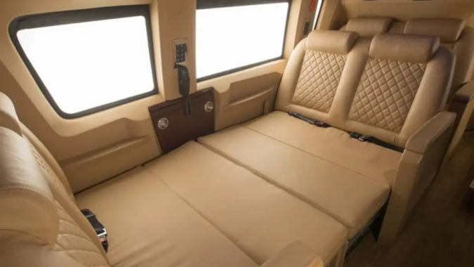 Esta casa rodante cuenta con capacidad de hasta ocho personas, incluye un dormitorio independiente, y opcionalmente puede montarse una cocina pequeña, baño con inodoro, lavabos y ducha.