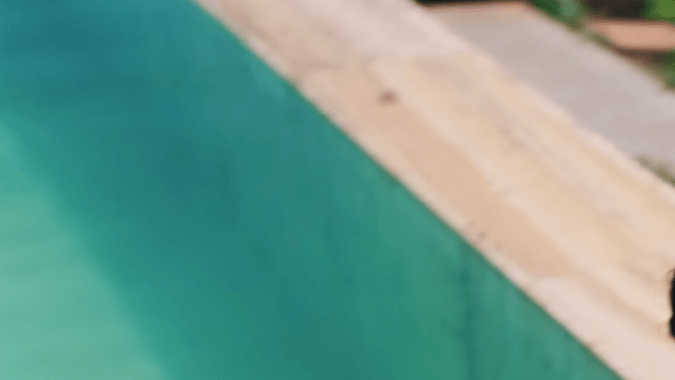 Al comienzo del audiovisual, aparece Georgina caminando hacia una piscina de forma rectangular bastante larga, con un vestido en tonos degradados de la marca Ferragamo, esta prenda ya la había utilizado en un viaje que hizo a Venecia.