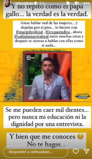 «Él está en un programa de opinión donde se opina de todo. Lo mismo que estás utilizando en mi contra, lo puedo utilizar en tu contra. Te estás metiendo en lo que no te importa a ti… Es absurdo lo que este pana está diciendo», dijo mientras daba paso a lo que Carlos contó en su programa.