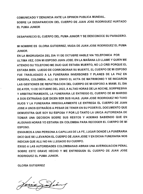 Mediante un comunicado dirigido a las autoridades colombianas, Gloria Gutiérrez, esposa de El Puma junior reveló que en un principio no podía creer que su esposo había muerto, quien en el momento de su deceso se encontraba en Pereira y ella en Estados Unidos.