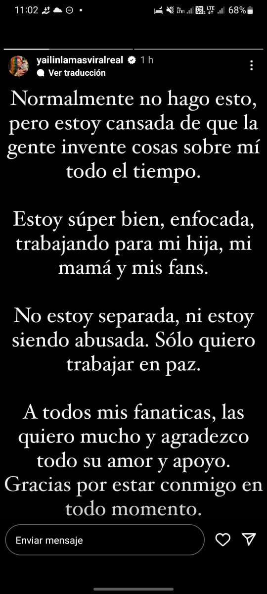 Mediante sus ‘stories’ en Instagram, Jorgina Guillermo, como es el verdadero nombre de Yailin La Más Viral, destacó que normalmente no hace esto, pero que está cansada que las personas inventen cosas de ella todo el tiempo.