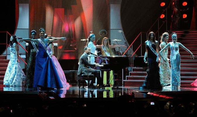 El artista John Legend (C) actúa con Miss República Dominicana 2010, Eva Arias (R), durante el concurso Miss Universo 2010 en el Mandalay Bay Events Center el 23 de agosto de 2010 en Las Vegas, Nevada. Crédito: Ethan Miller | Getty Images