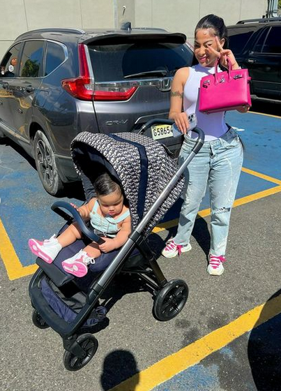A través de sus historias de Instagram, la dominicana publicó dos fotos con su hija Cattleya y en las postales aparece con su cartera en la mano izquierda, mientras que con la otra sostiene el coche de la bebé.