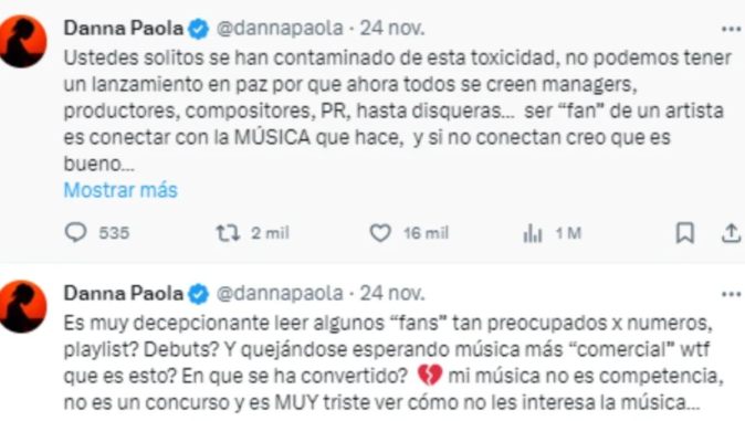 “Es muy decepcionante leer algunos ‘fans’ tan preocupados por números ¿playlist, debuts? Y quejándose esperando música más ‘comercial’ wtf ¿qué es esto, en que se han convertido? Mi música no es competencia, no es un concurso y es MUY triste ver cómo no les interesa la música”, expresó la artista.