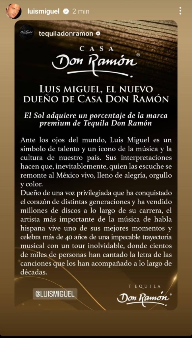 Así lo reveló el Sol de México a través de su cuenta de Instagram, en la que compartió un comunicado de la marca de tequila Don Ramón que lo anunció como nuevo dueño de la empresa.
