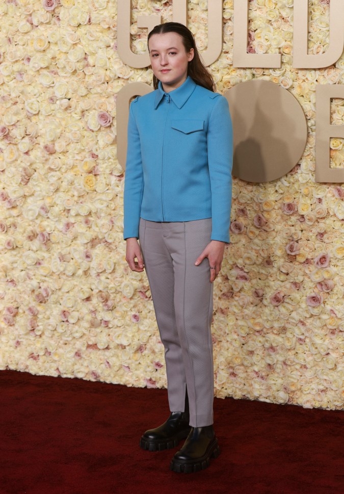 La actriz británica, Bella Ramsey, lució un pantalón gris con una camisa azul. Está nominada por su trabajo en ‘The Last of Us’ de HBO.