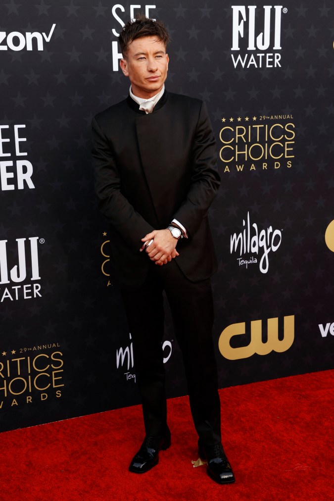 El protagonista de la película ‘Saltburn’, Barry Keoghan, lució un traje negro con blanco. El cuello hace recordar a los diseños asiáticos y fue el gancho del look.