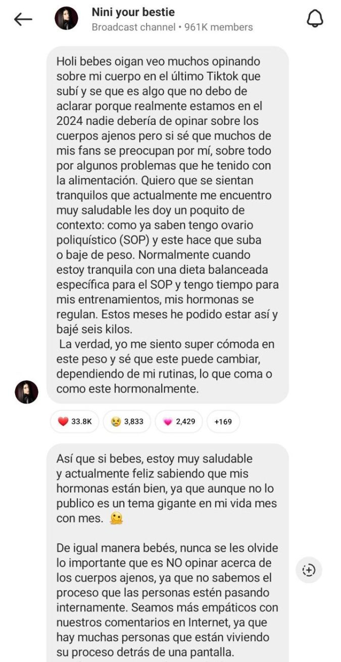La intérprete de ‘Malas decisiones’, usó su canal de Instagram para responder a las críticas. “Sé que es algo que no debo aclarar porque realmente estamos en el 2024 y nadie debería opinar sobre los cuerpos ajenos, pero sí sé que muchos fans se preocupan por mí, sobre todo por algunos problemas de alimentación que he tenido”, dijo en el mensaje.