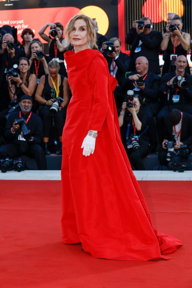 Otra actriz que prefirió el rojo en el segundo día del Festival de Cine de Venecia fue la actriz francesa Isabelle Huppert. De la firma Balenciaga, la famosa escogió un vestido con mangas largas y llamativa cola. Sus gantes blancos tampoco pasaron desapercibidos.