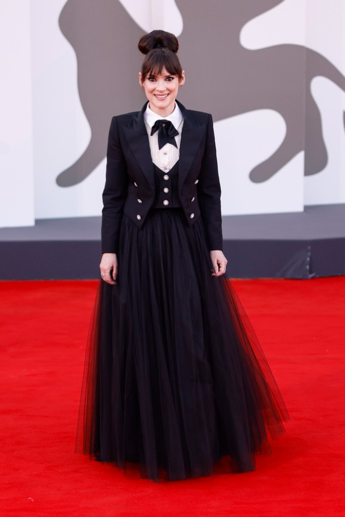 Acompañada por su esposo Tim Burton, la actriz italiana optó por un vestido largo de satén negro con mangas voluminosas y un llamativo escote. El diseño fue confeccionado a mano en el atelier londinense de Vivienne Westwood.