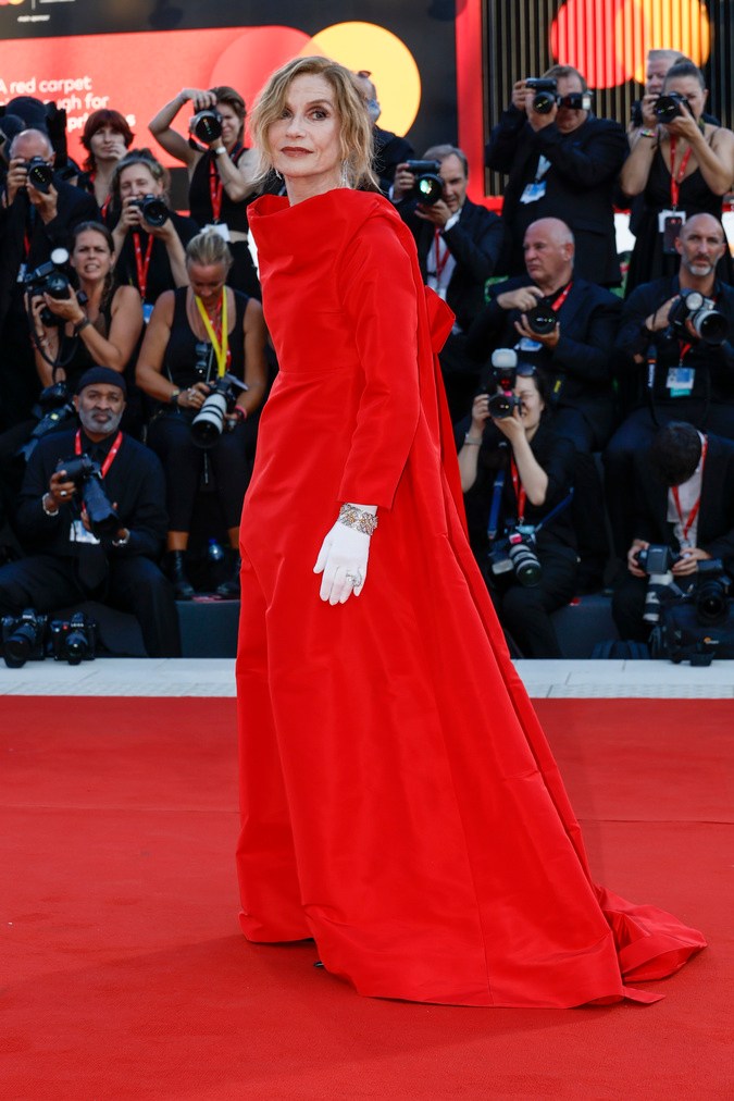 Otra actriz que prefirió el rojo en el segundo día del Festival de Cine de Venecia fue la actriz francesa Isabelle Huppert. De la firma Balenciaga, la famosa escogió un vestido con mangas largas y llamativa cola. Sus gantes blancos tampoco pasaron desapercibidos.