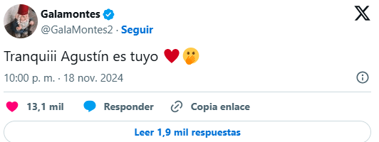 La situación entre los dos se volvió mucho más tensa en las redes sociales cuando Gala Montes fue mucho más directa con sus comentarios. “Tranquiii, Agustín es tuyo”, expresó.