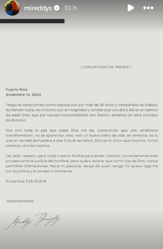 «Tengo el compromiso como esposa aún por más de 30 años y compañera de trabajo de Ramón Ayala, les informo con la integridad y verdad que vivo día a día en el camino de Papá Dios, que, por causas irreconciliables con Ramón, estamos en proceso de divorcio», señala en principio el comunicado que publicó el pasado 13 de diciembre.