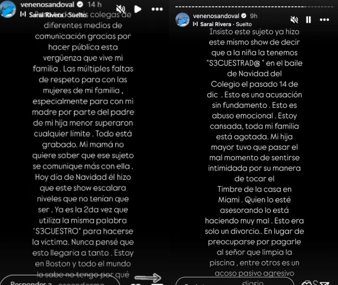 «Este sujeto ya hizo este mismo show de decir que a la niña la tenemos «secuestrada» en el baile de Navidad del colegio el pasado 14 de diciembre. Esto es una acusación sin fundamento», expresó Sandoval en sus stories.