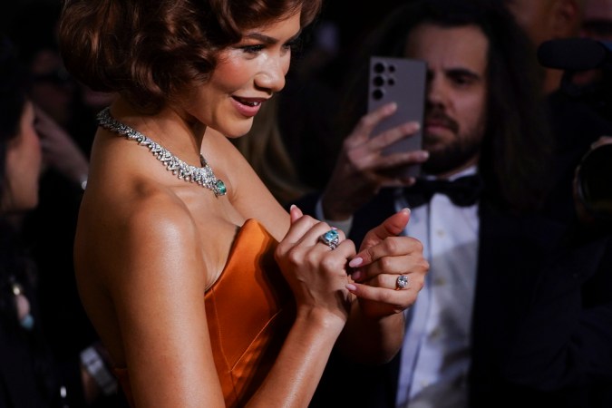 Aunque la protagonista de ‘Challengers’ lució un espectacular vestido satinado de color ladrillo con una falda trasera de Louis Vitton, que además acompañó con una gargantilla de Bvlgari, realmente la famosa llamó bastante la atención por la joya que tenía en su mano izquierda, que según People, es una pieza de la orfebre londinense Jessica McCormack.