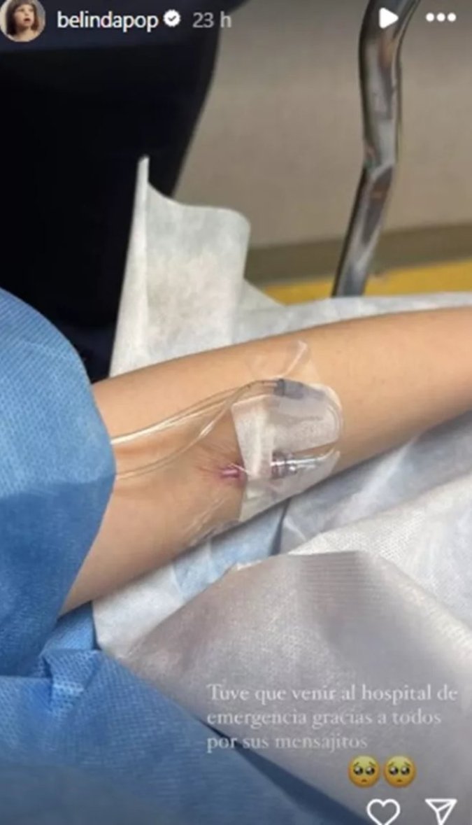 Belinda causó gran preocupación en sus fanáticos al revelar que había sido hospitalizada de emergencia. La cantante publicó una foto en sus historias de Instagram en la que aparece acostada en una camilla recibiendo un aparente tratamiento a través de una vía que le agarraron en su mano izquierda.
