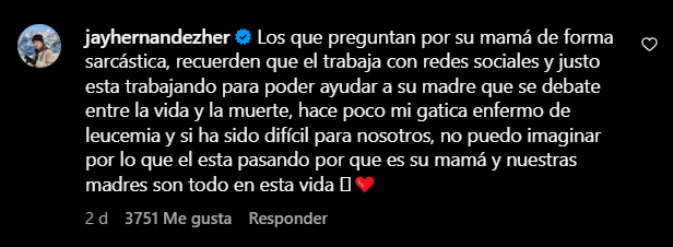 “Los que preguntan por su mamá de forma sarcástica, recuerden que él trabaja con redes sociales y justo está trabajando para poder ayudar a su madre que se debate entre la vida y la muerte, hace poco mi gatica enfermo de leucemia y si ha sido difícil para nosotros, no puedo imaginar por lo que él está pasando porque es su mamá y nuestras madres son todo en esta vida”, dijo.