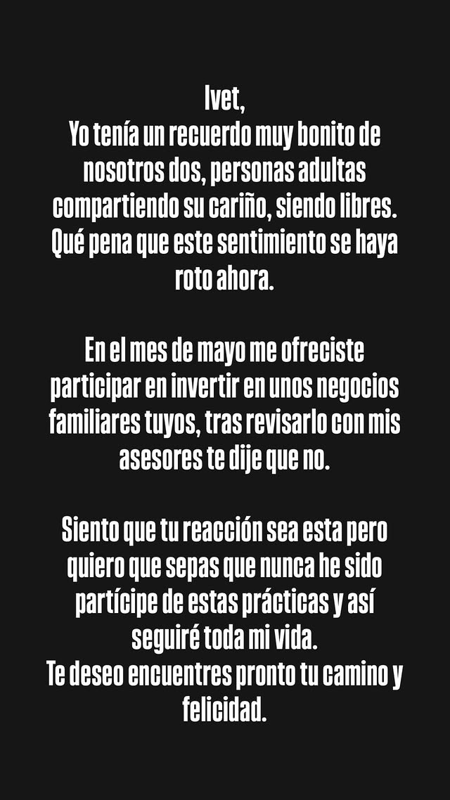 “En el mes de mayo me ofreciste participar en invertir en unos negocios familiares tuyos, tras revisarlos con mis asesores te dije que no. Siento que tu reacción sea esta, pero quiero que sepas que nunca he sido partícipe de esas prácticas y así seguiré toda mi vida”, comentó.