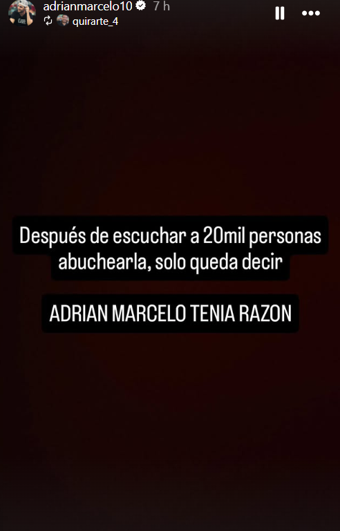 “Después de escuchar a 20 mil personas abuchearla, solo queda decir: Adrián Marcelo tenía razón”, se leía en la historia compartida en Instagram.