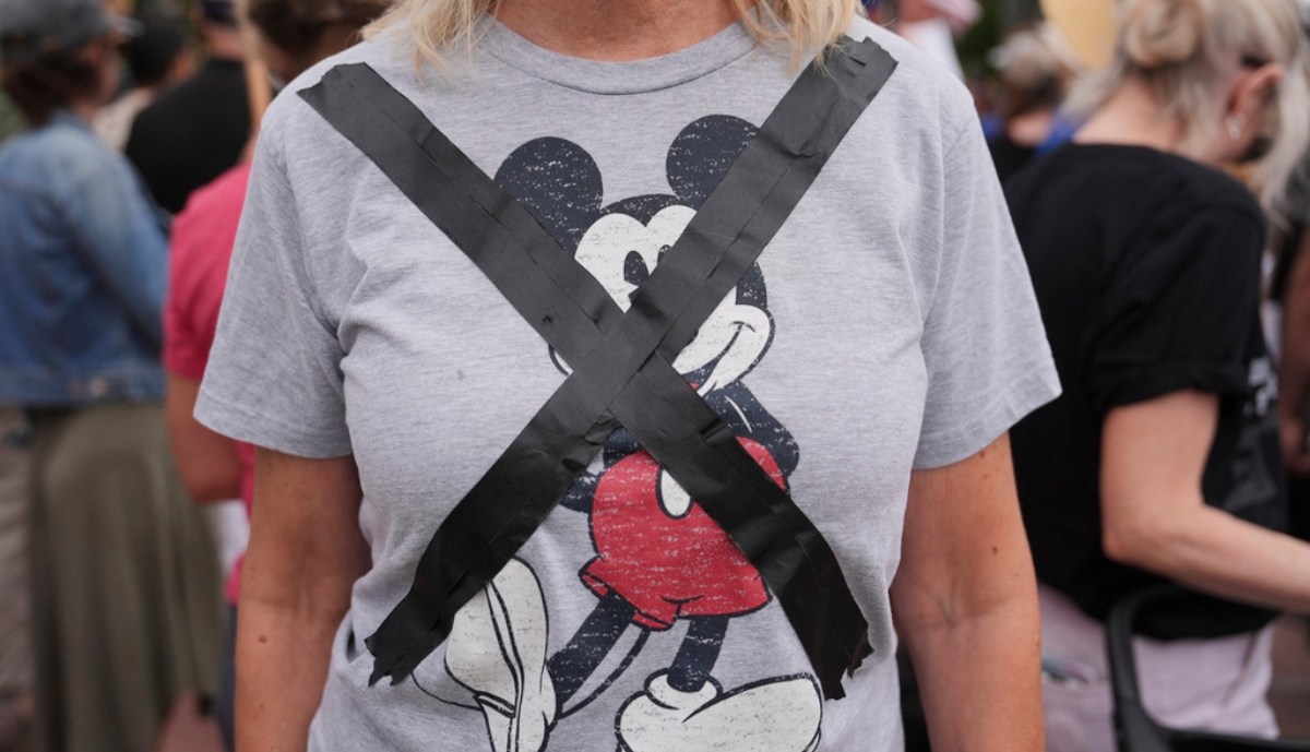Manifestantes critican a Disney en respuesta a la suspensión del espectáculo nocturno de Jimmy Kimmel. Crédito: Jae C. Hong | AP