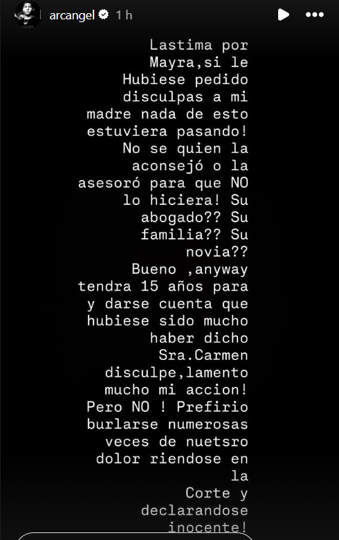 Ante la nueva ratificación de la sentencia, Arcángel recurrió a sus redes sociales para pronunciarse en varias historias, insistiendo en que su intención nunca fue llegar a estas consecuencias.