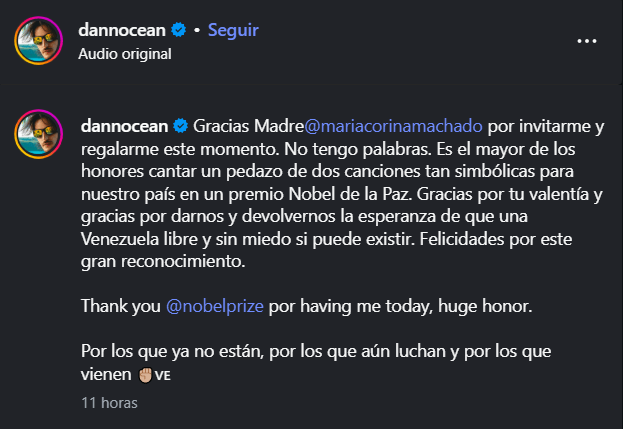 “Gracias, Madre @mariacorinamachado, por invitarme y regalarme este momento. No tengo palabras. Es un honor enorme cantar fragmentos de dos canciones tan simbólicas para nuestro país en un Premio Nobel de la Paz”, escribió.