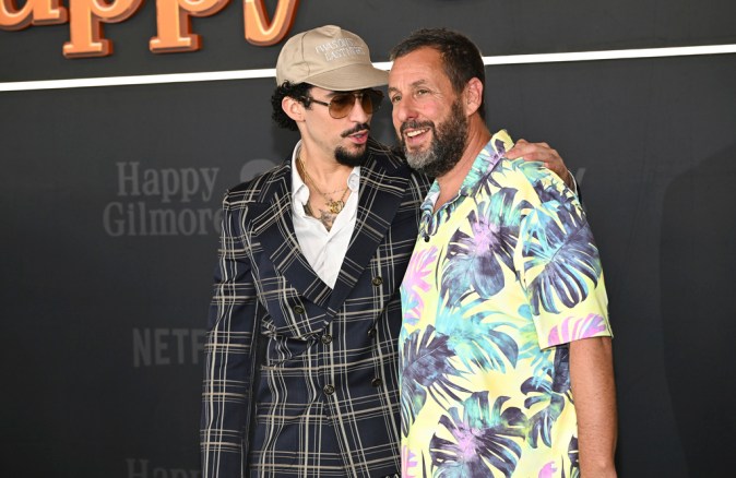 Benito Antonio Martínez Ocasio (alias Bad Bunny), a la izquierda, y Adam Sandler en el estreno de «Happy Gilmore 2» de Netflix en el Jazz at Lincoln Center el lunes 21 de julio de 2025 en Nueva York.