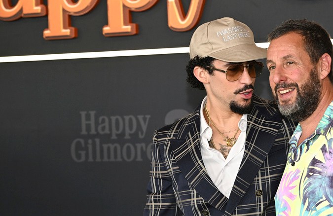 Benito Antonio Martínez Ocasio (alias Bad Bunny), a la izquierda, y Adam Sandler en el estreno de «Happy Gilmore 2» de Netflix en el Jazz at Lincoln Center el lunes 21 de julio de 2025 en Nueva York.