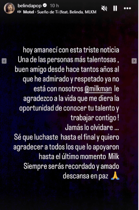 “Hoy amanecí con esta triste noticia. Una de las personas más talentosas, buen amigo desde hace tantos años, al que he admirado y respetado, ya no está con nosotros. @milkman, le agradezco a la vida que me diera la oportunidad de conocer tu talento y trabajar contigo…”, escribió la cantante.