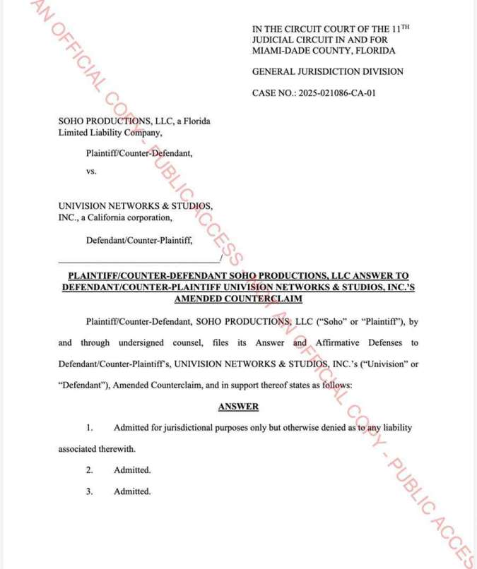 “Soho afirma categóricamente que las reclamaciones de Univision están impedidas, total o parcialmente, por la doctrina de las ‘manos sucias’ (unclean hands), dado que Univision ha actuado de manera ilícita y en incumplimiento de sus obligaciones en relación con la presente disputa y con el Acuerdo de Producción y sus enmiendas conexas”, dice parte del texto publicado por el medio.