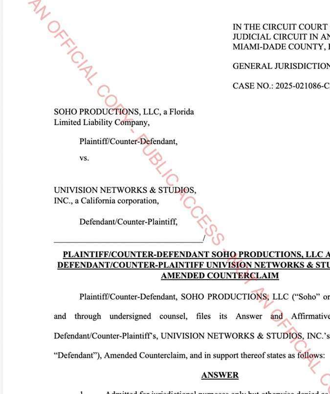 “Soho afirma categóricamente que las reclamaciones de Univision están impedidas, total o parcialmente, por la doctrina de las ‘manos sucias’ (unclean hands), dado que Univision ha actuado de manera ilícita y en incumplimiento de sus obligaciones en relación con la presente disputa y con el Acuerdo de Producción y sus enmiendas conexas”, dice parte del texto publicado por el medio.